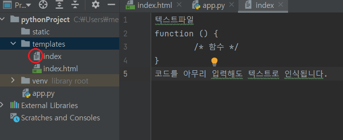 Flask를 구동할 경우에도 파일 구조가 중요한데, templates 폴더 내부에 index.html 파일명으로 위치해야 한다. 하지만 위처럼 index 파일이 text 확장자로 존재하면 오류가 뜨게 된다.