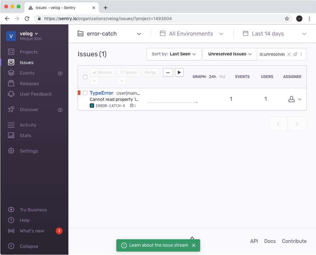 Sentry 라는 상용서비스를 통해서 에러가 발생하면 실시간으로 모니터링을 받을 수 있다.