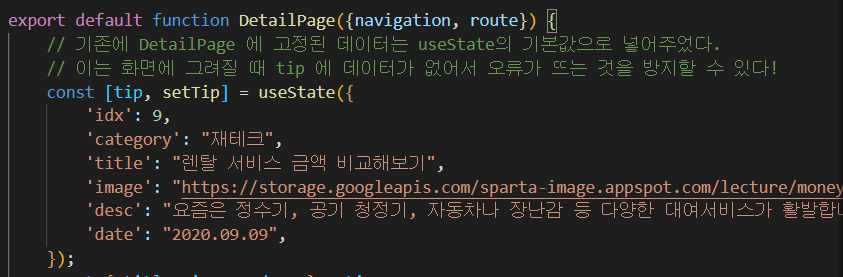 // 기존에 DetailPage 에 고정된 데이터는 useState의 기본값으로 넣어주었다.