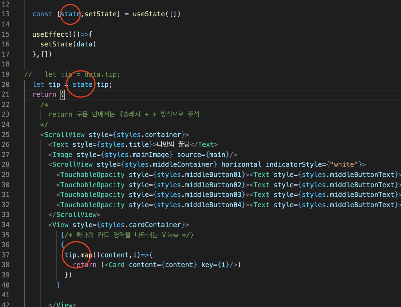 🚨 여기도 마찬가지로 useState 를 통해 데이터 상태를 관리해주고 있고, useEffect 에서 화면이 그려진 후에 setTip 으로 데이터가 담길 수 있도록 작성되어 있다.