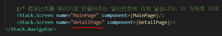 : StackNavigator.js 에서 Stack.Screen 을 통해 컴포넌트를 연결시켜 페이지화 시켜주었고,