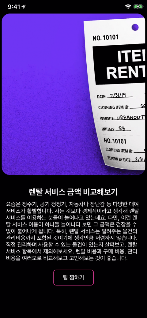 desc: "요즘은 정수기, 공기 청정기, 자동차나 장난감 등 다양한 대여서비스가 활발합니다. 사는 것보다 경제적이라고 생각해 렌탈 서비스를 이용하는 분들이 늘어나고 있는데요. 다만, 이런 렌탈 서비스 이용이 하나둘 늘어나다 보면 그 금액은 겉잡을 수 없이 불어나게 됩니다. 특히, 렌탈 서비스는 빌려주는 물건의 관리비용까지 포함된 것이기에 생각만큼 저렴하지 않습니다. 직접 관리하며 사용할 수 있는 물건이 있는지 살펴보고, 렌탈 서비스 항목에서 제외해보세요. 렌탈 비용과 구매 비용, 관리 비용을 여러모로 비교해보고 고민해보는 것이 좋습니다. ",