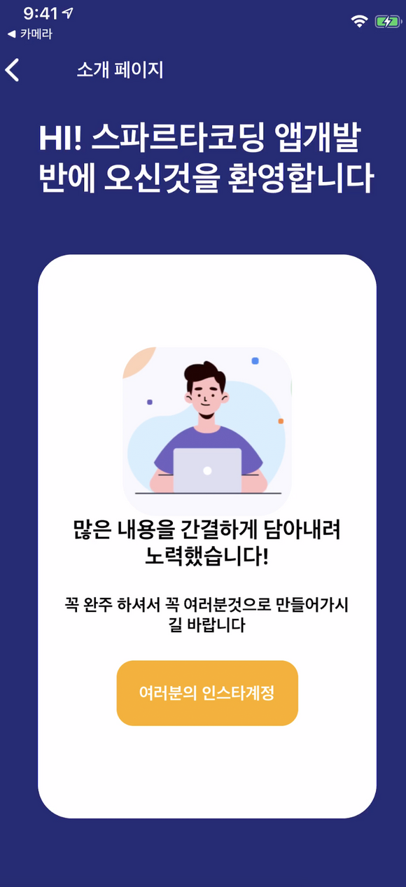 - 2주차에 만들었던 AboutPage 를 MainPage 에 연결시키고, AboutPage 에는 인스타나 블로그 주소 혹은 아무 주소를 하단 버튼에 연결시켜주자.