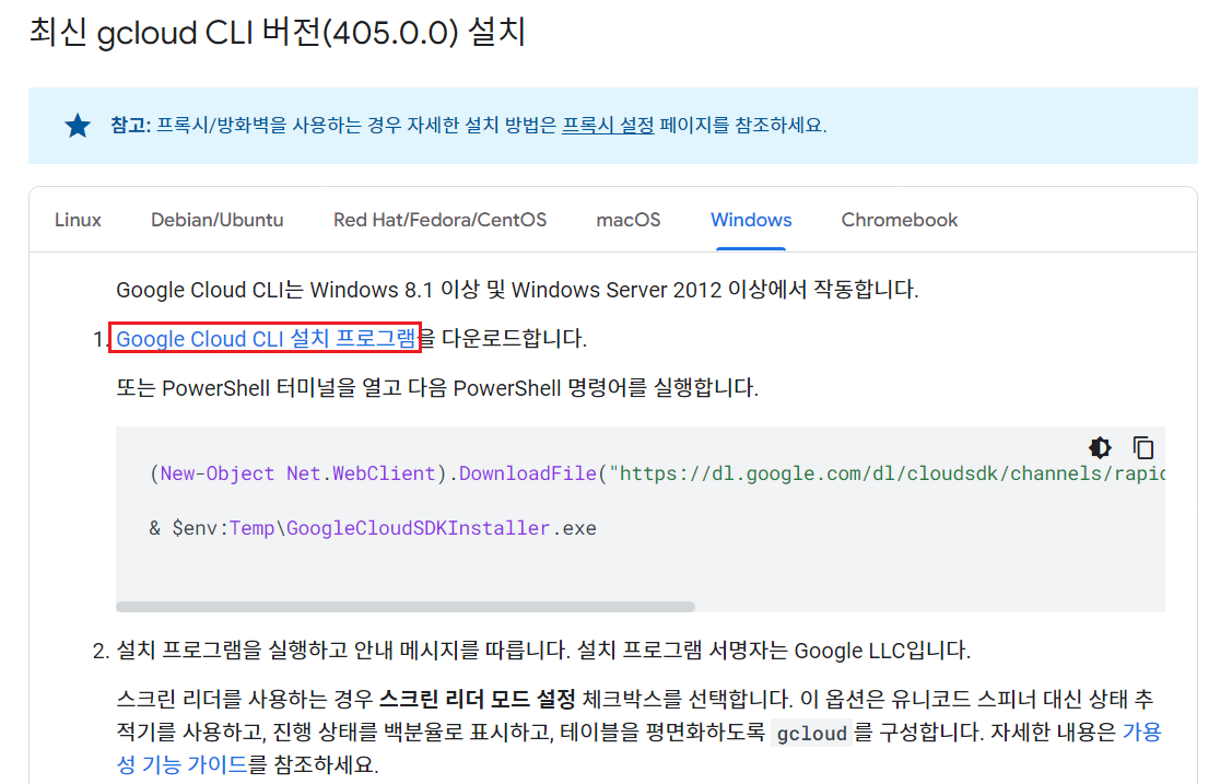 Cloud SDK 문서에 보면 각 환경별로 설치하는 방법에 대한 설명이 자세히 나와있다.