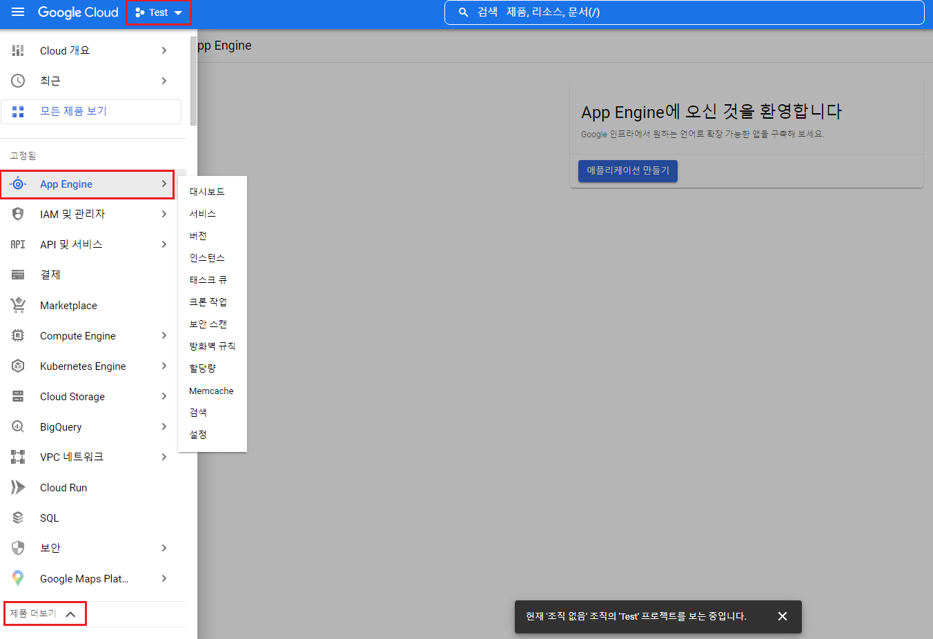 만약에 보이지 않는다면 메뉴 제일 하단에 제품 더보기를 눌러서 App Engine을 찾으면 된다.