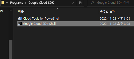 경로는 설치되어 있는 경로를 찾으면 된다. 윈도우 하단에 검색에서 Google cloud sdk shell 프로그램을 검색 후 오른쪽 마우스 - 파일 위치 열기