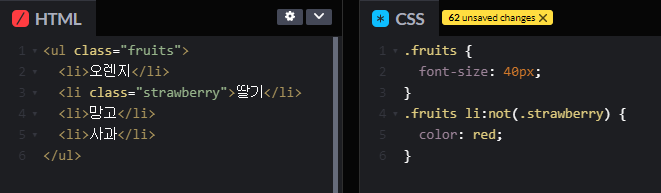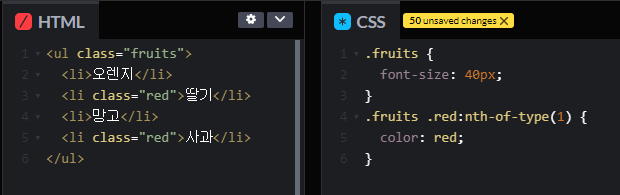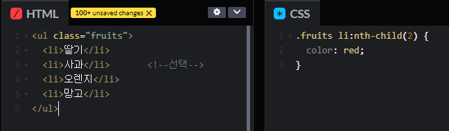 (O) class fruits의 후손 중에 첫번째 자식을 찾아라. 그 자식이 p 태그인지 확인하고 맞다면 선택해라