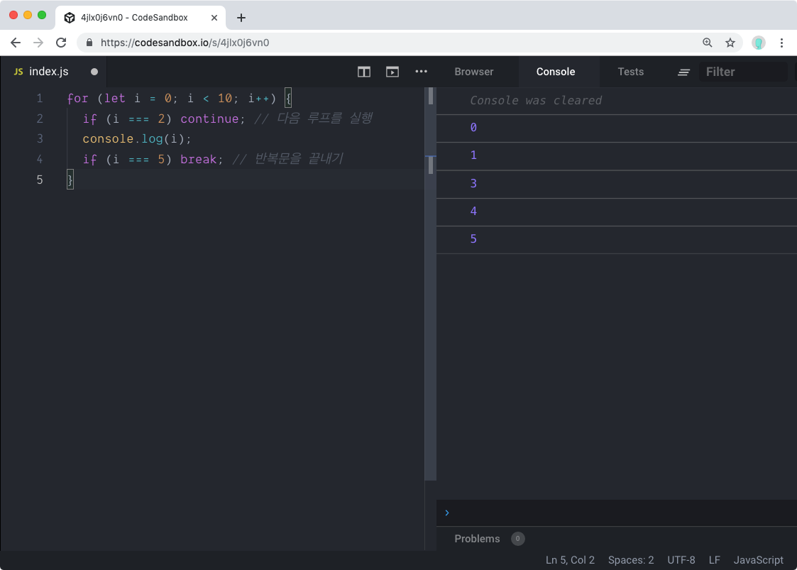 i 가 2 일 땐 continue 를 하여 원래 console.log 를 해야 하지만 그 코드를 수행하지 않고 바로 3으로 넘어간다.