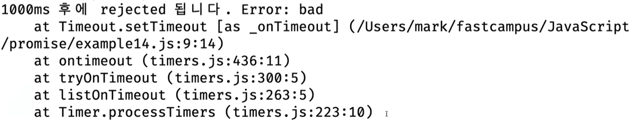 마찬가지로 프로미스 객체와 rejected 되는 시점에 p.catch 안에 설정한 callback 함수가 실행된다.