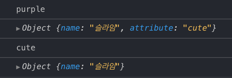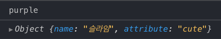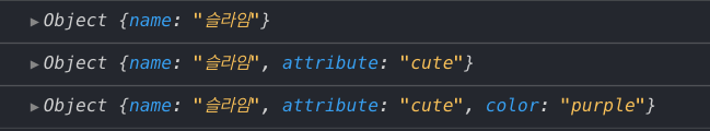 console.log(purpleCuteSlime); // {name: '슬라임', attribute: 'cute', color: 'purple'}
