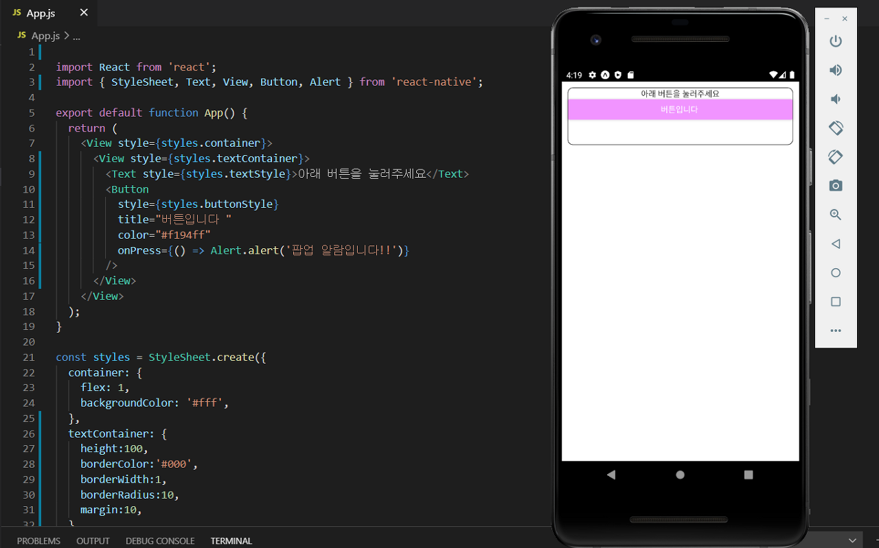 - Run on Android device/emulator: 컴퓨터와 USB로 연결된 안드로이드 휴대폰 또는 우리가 설치한 안드로이드 시뮬레이터로 Expo를 실행시키는 버튼