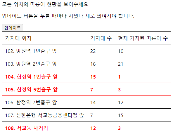 - 업데이트 버튼을 누를 때마다 지웠다 새로 씌워지며 거치대 위치, 거치대 수, 현재 거치된 따릉이 수를 표시한다.
