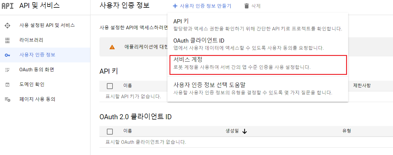 [사용자 인증 정보] - [사용자 인증 정보 만들기] - [서비스 계정] 으로 계정을 하나 생성해준다.