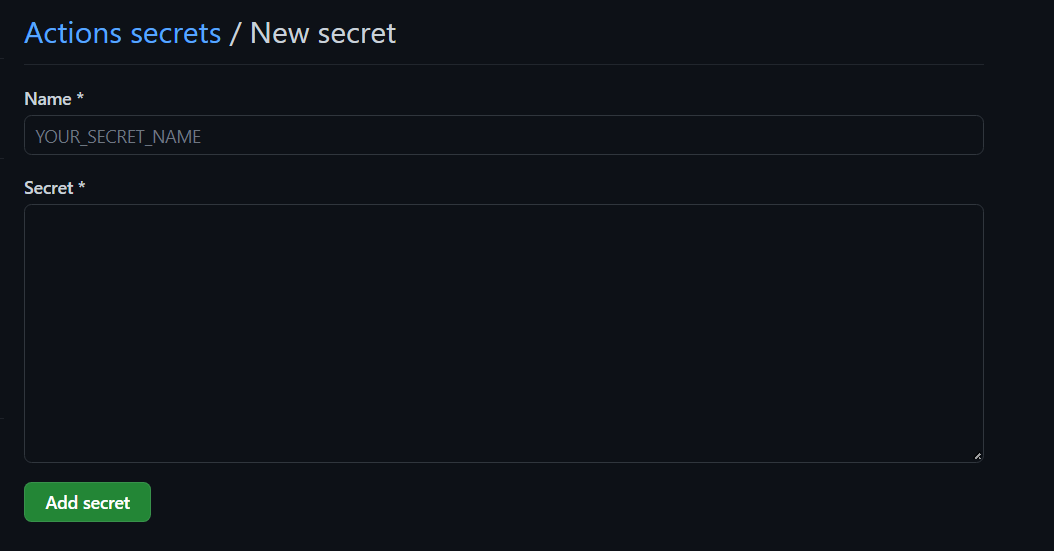 Name* 에는 설정할 키 이름, Secret* 에는 해당 키에 설정할 값을 작성해주면 된다.