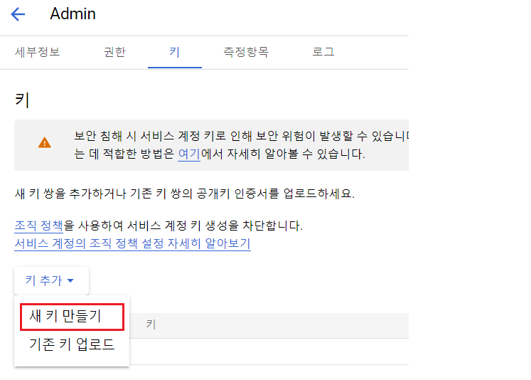 해당 이메일을 눌러 링크로 들어가보면 키 탭에서 [새 키 만들기]를 통해 키를 발급받을 수 있다.