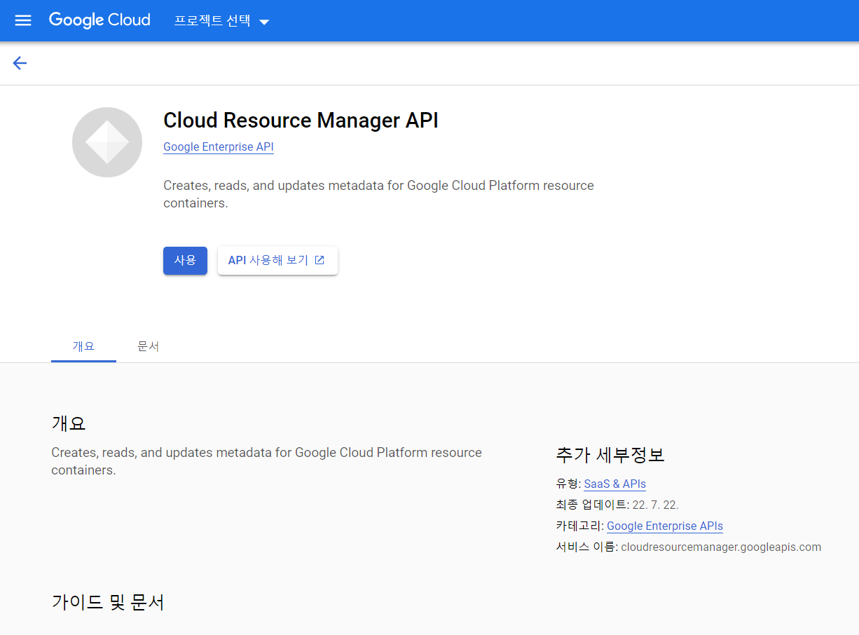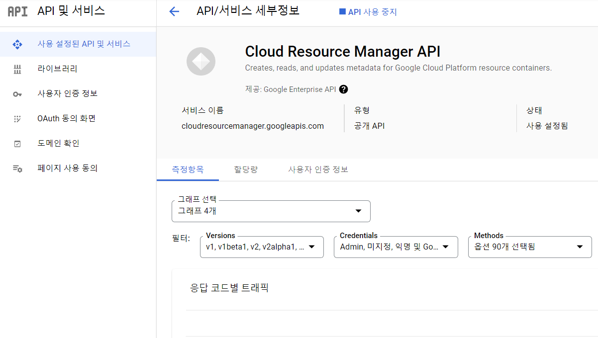 [사용] - [프로젝트 선택] 하면 해당 프로젝트의 API 및 서비스 링크로 넘어간다.