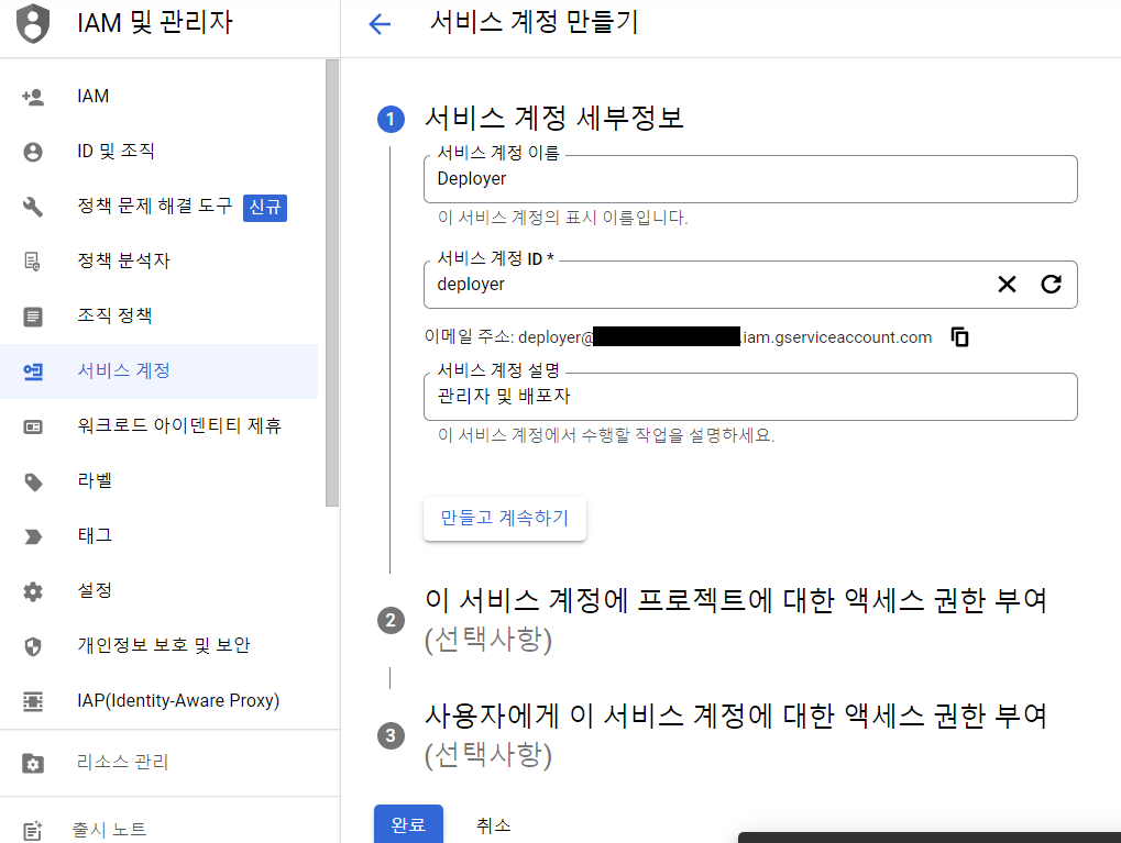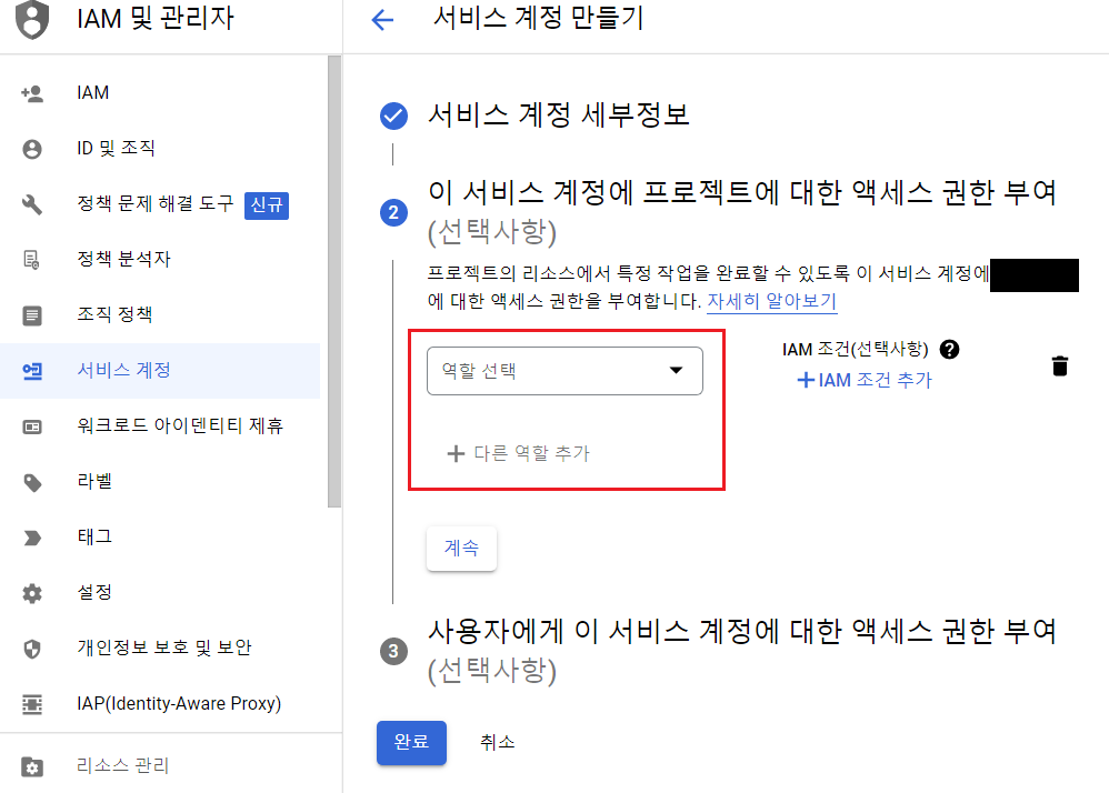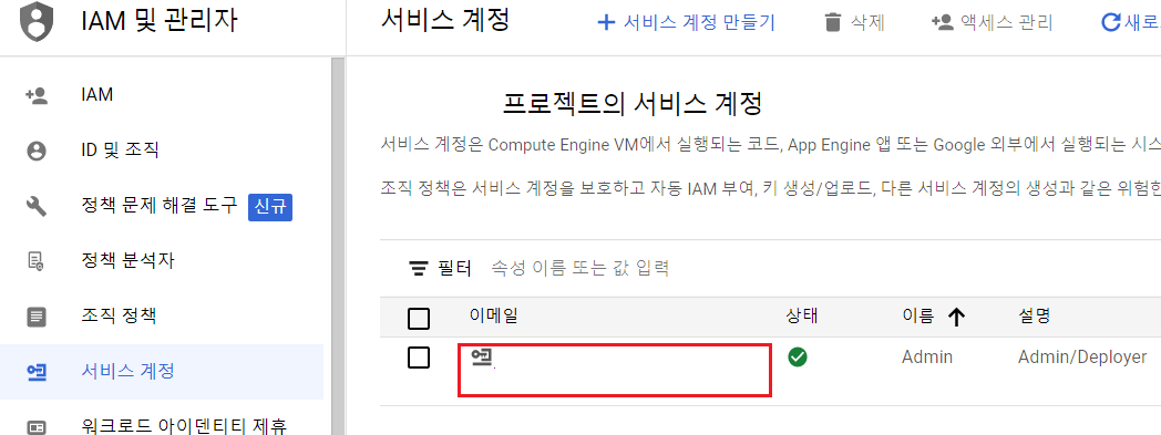 권한을 설정해준 뒤, [계속] - [완료] 를 통해 계정이 생성되면 서비스 계정에서 확인할 수 있다.