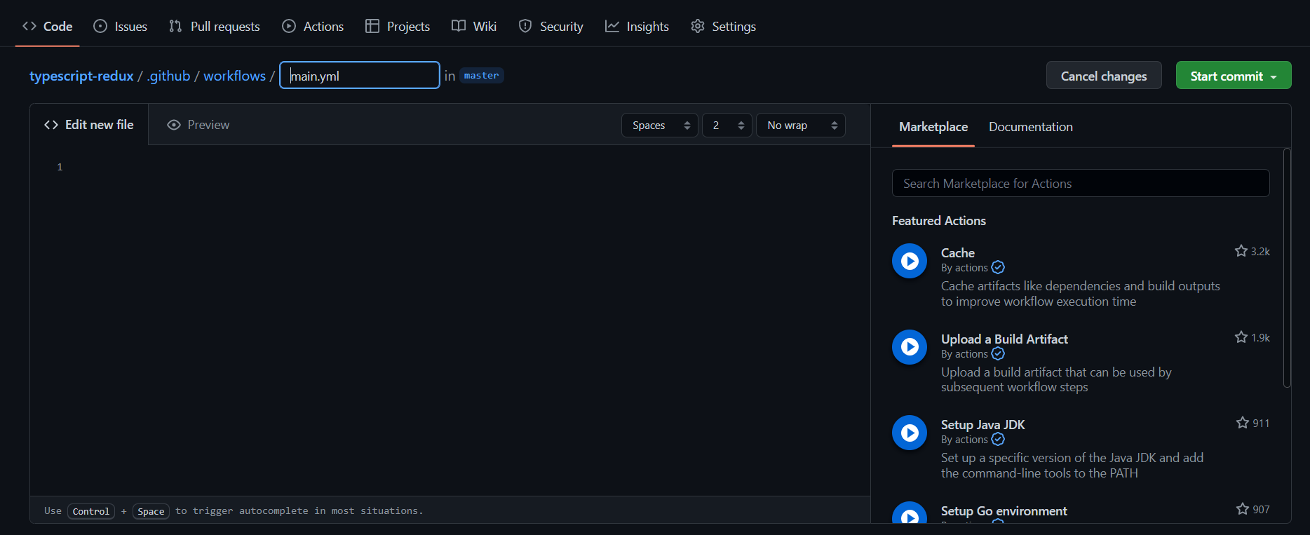 set up a workflow yourself 링크로 들어가면 해당 저장소의 main.yml 파일을 설정하는 곳으로 연결된다.