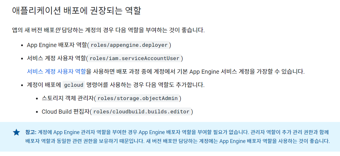 App engine 애플리케이션 배포할 경우 위와 같은 권한들이 필요하다고 안내되어 있다.