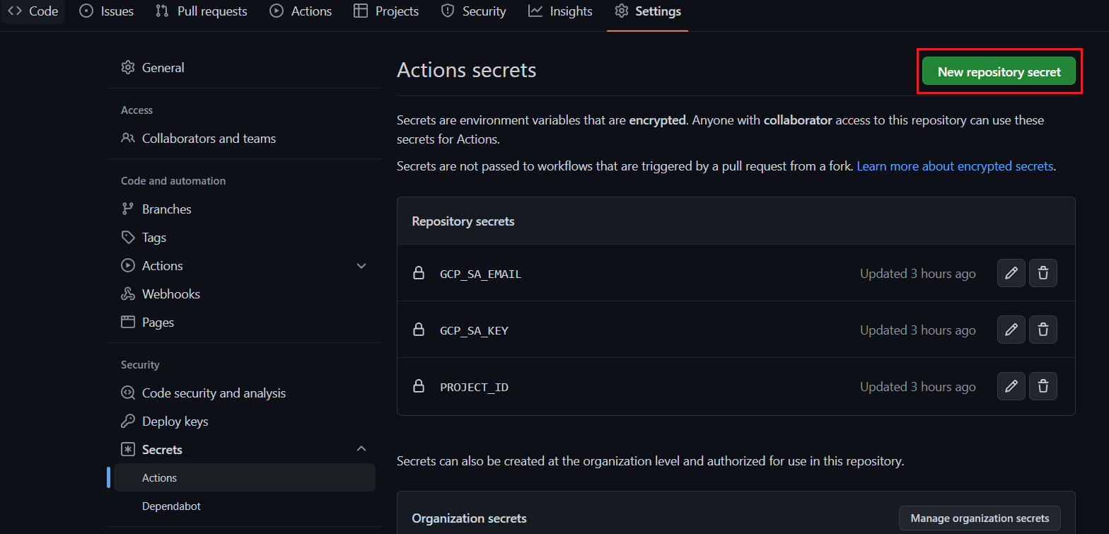 레포지토리 - Settings - Actions - New repository secret 버튼을 눌러서 새로운 키를 추가할 수 있다.