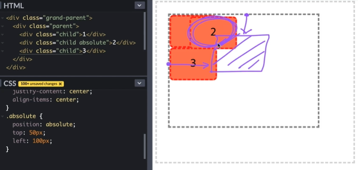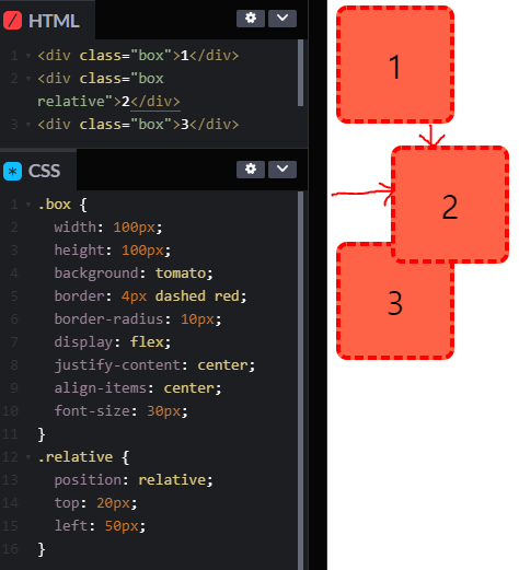 - absolute 속성을 추가하면 1, 2, 3 순서대로 쌓이지 않고 2번은 부모 요소를 기준으로 배치되고, 1, 3번 박스는 2번 박스 아래에 위치하게 된다.