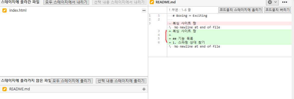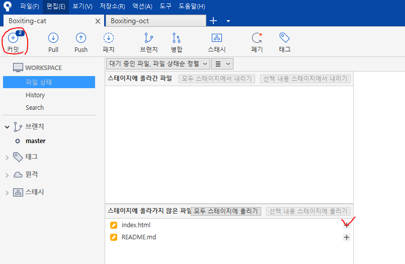 변경된 파일이 존재할 때 위와 같이 뜨는데, 커밋을 누른 뒤, add를 하기를 원하는 파일을 옆에 + 버튼을 눌러 스테이지에 올려준다.