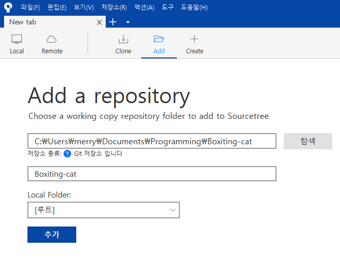 설치한 소스트리에 내 컴퓨터에서 이미 만든 로컬 저장소 추가하기